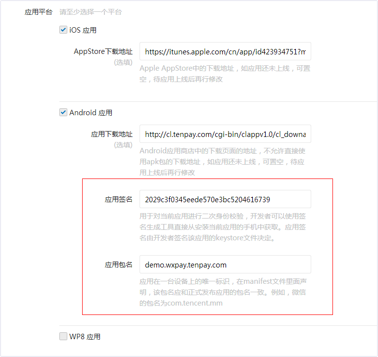 위챗 오픈플랫폼에서 개발 어플리케이션을 신청하시면 위챗 오픈플랫폼에서는 어플리케이션의 고유 식별 아이디를 생성해 드립니다. 안전한 결제를 위해 오픈플랫폼에 업체의 어플리케이션 패키지 이름과 어플리케이션 서명(signature)을 연동시키셔야 합니다. 연동 후에 정상적으로 결제가 가능합니다. 설정화면은 <오픈플랫폼>의 <관리센터/어플리케이션 수정/개발데이터 수정>메뉴에 있으며 그림 8.8의 빨간 네모로 표시되어 있는 부분입니다.